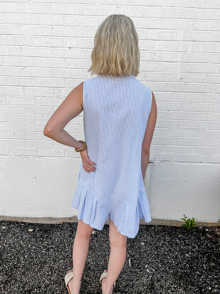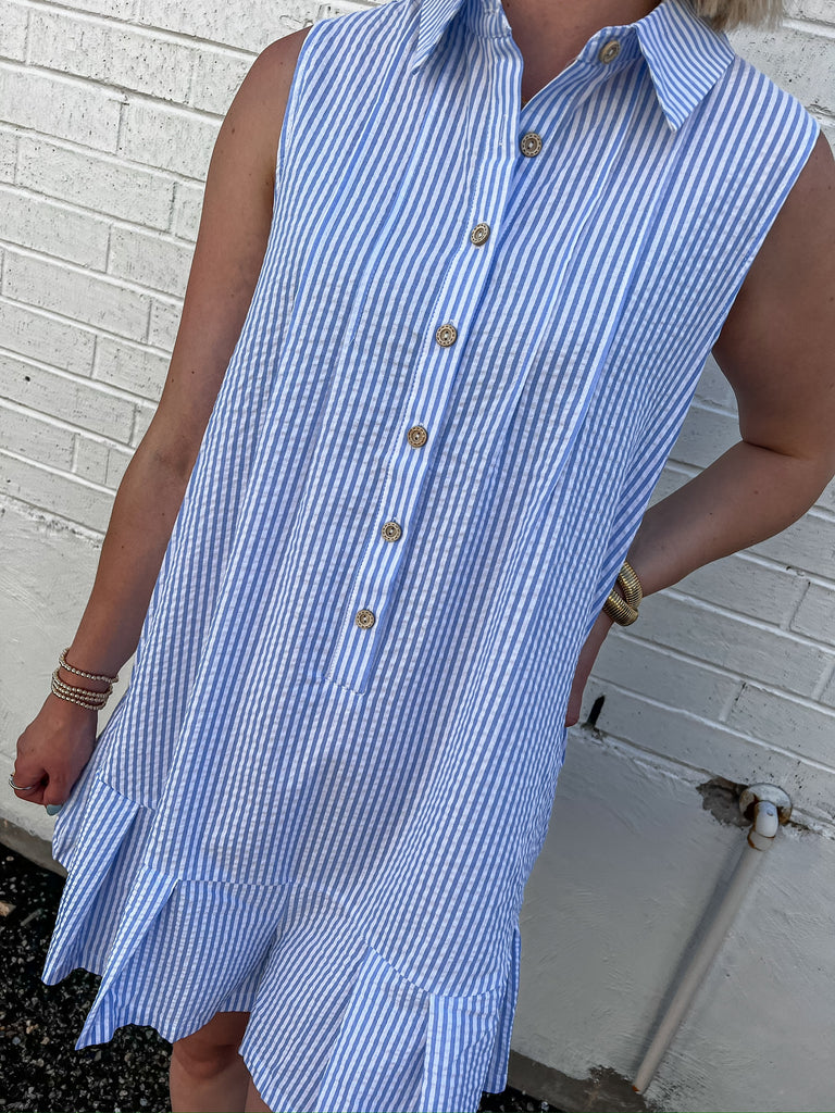 Our blue and white striped romper is here to steal the show! Sleeveless with a flirty ruffle bottom, it shows charm and sophistication. With its button-up front, it's like wearing a playful dress with the comfort of your favorite romper. Get ready to turn heads and make a statement wherever your adventures take you!