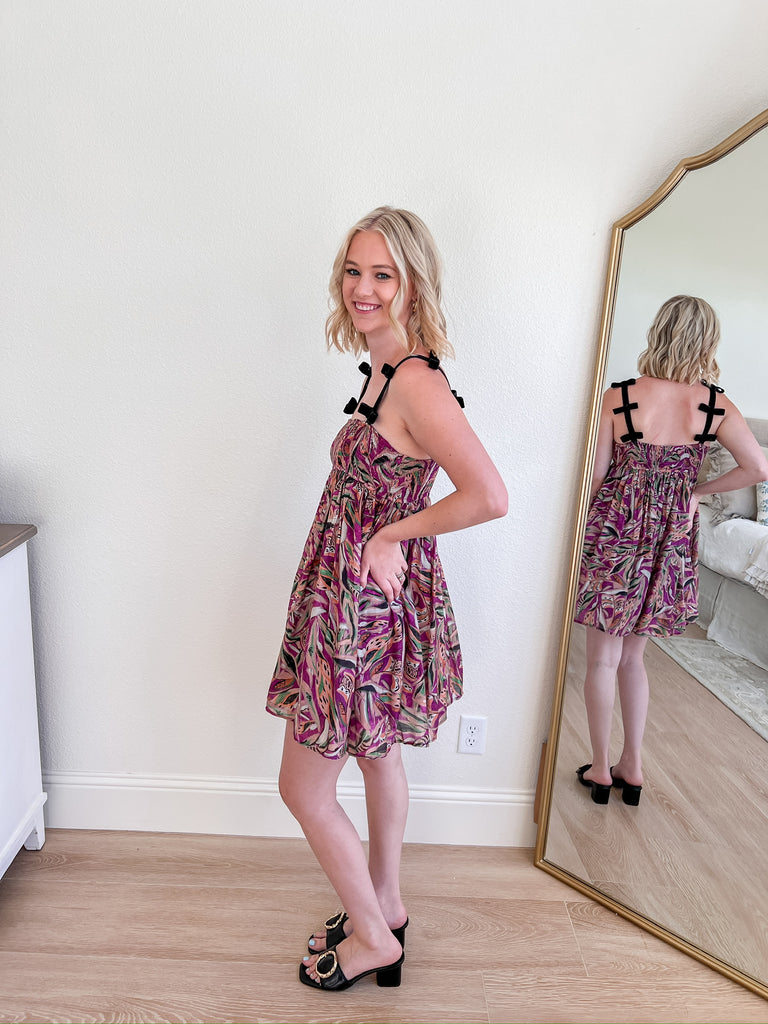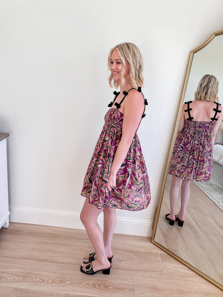 Turn heads with this flirty and fun mini dress, designed to bring a pop of color and playfulness to your wardrobe. Perfect for a day out, a festival, or a spontaneous weekend getaway, this dress is all about making a statement. The bold print and delicate details combine to create a look that's both youthful and chic.