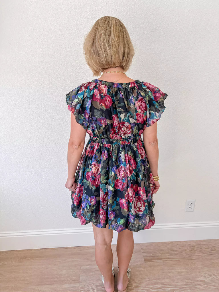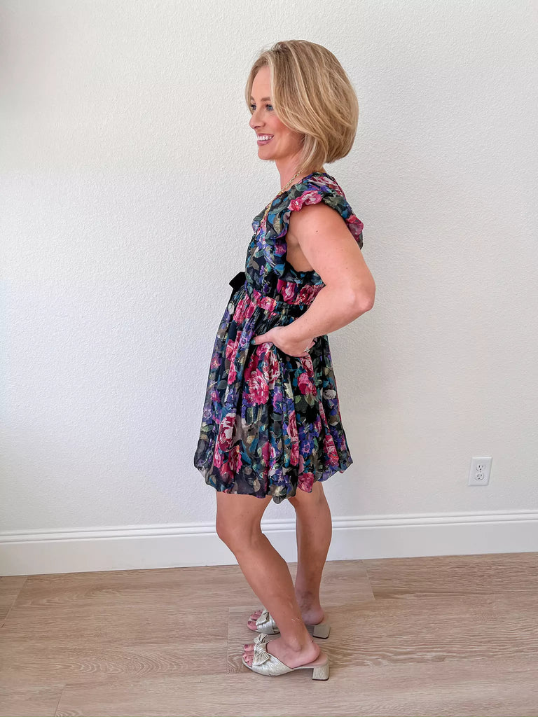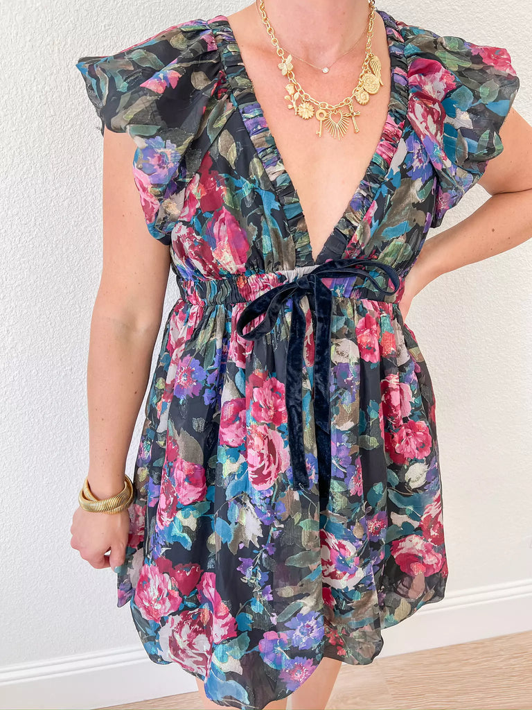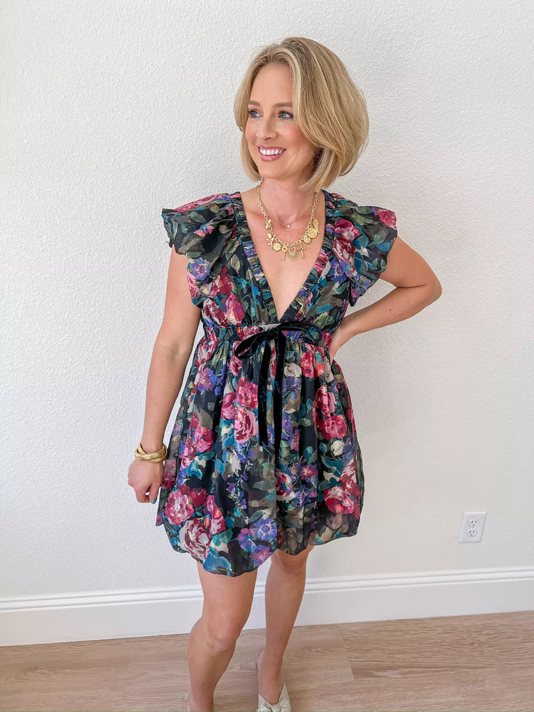 Embrace the beauty of this vibrant Floral Ruffle Sleeve Mini Dress, available in sizes. This statement mini dress features a striking floral print on a black backdrop, making it the perfect addition to your wardrobe for any special occasion. With its deep V-neckline, playful ruffle sleeves, and cinched waist with a bow tie detail, it adds a flirty yet sophisticated touch to your look.