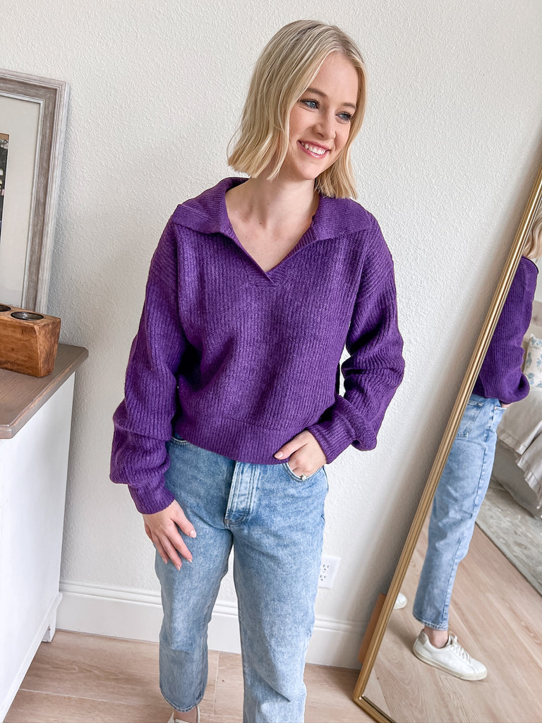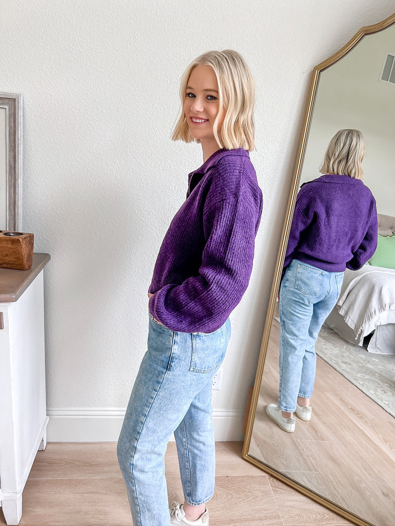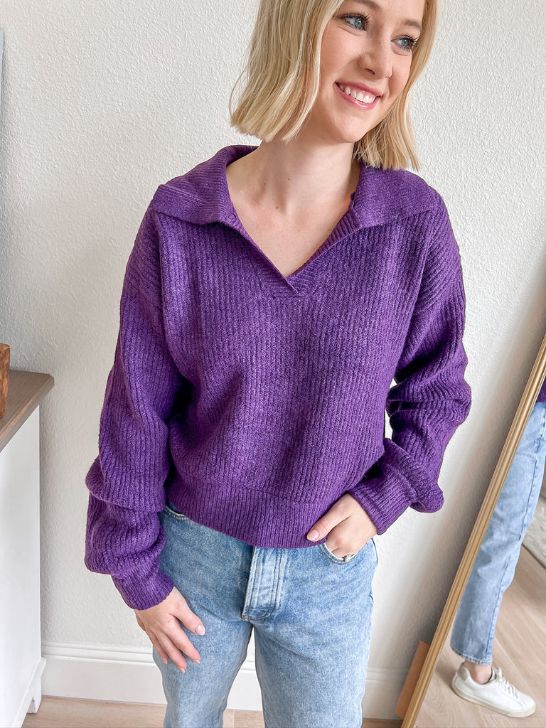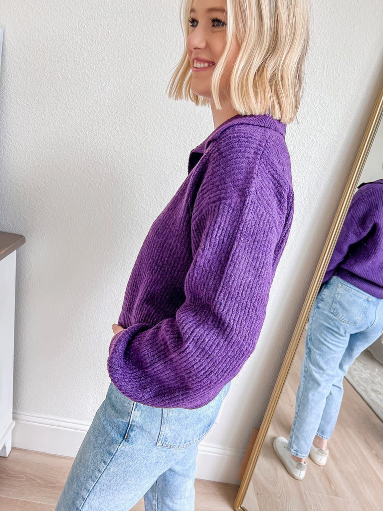 Stay stylish and comfortable with this chic popover sweater in a vibrant purple hue. The unique collared neckline adds a sophisticated touch, while the relaxed fit ensures all-day comfort. Perfect for layering or wearing on its own, this sweater is a versatile addition to your wardrobe. Pair it with your favorite jeans for a casual yet polished look that’s perfect for any occasion.