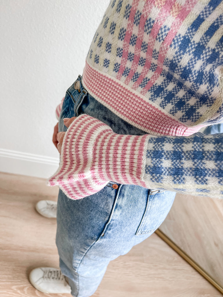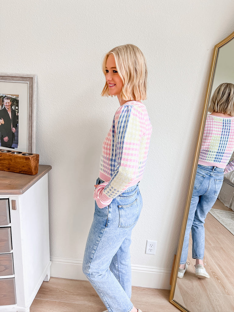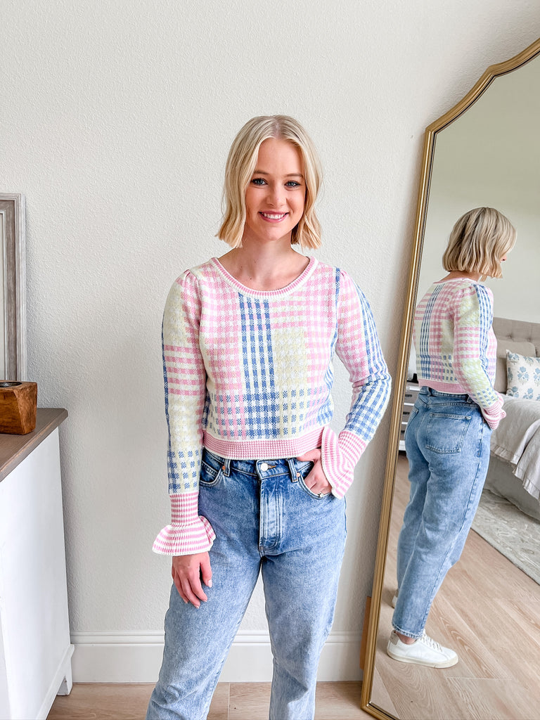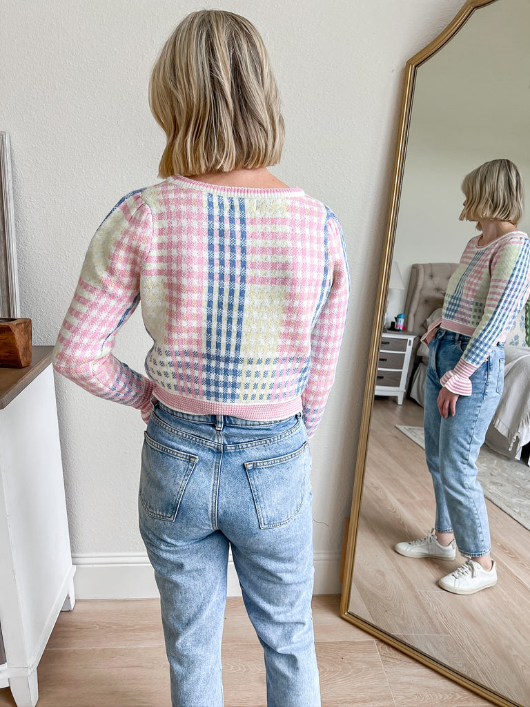 Add a touch of sweetness to your wardrobe with this charming pastel patchwork sweater. Featuring a delightful mix of soft pastel colors in a fun checkered pattern, this cropped sweater is perfect for bringing a playful yet stylish vibe to any outfit. The ruffled cuffs add a feminine touch, making it a great choice for both casual outings and more dressed-up occasions. Pair it with high-waisted jeans for an effortless look that's both cute and comfortable.