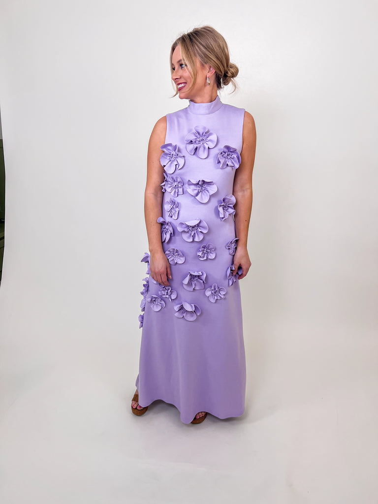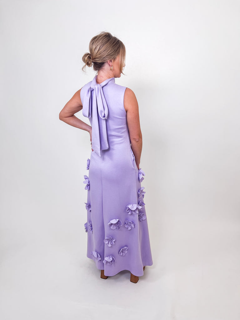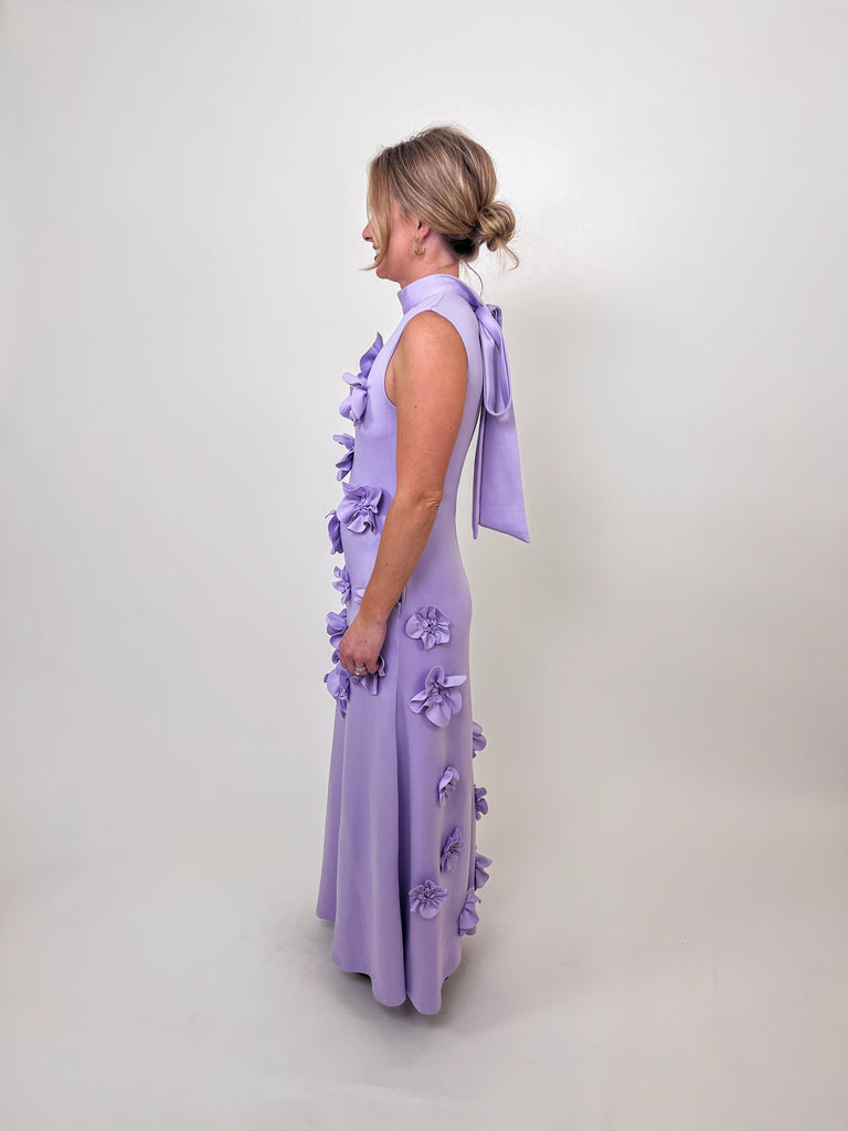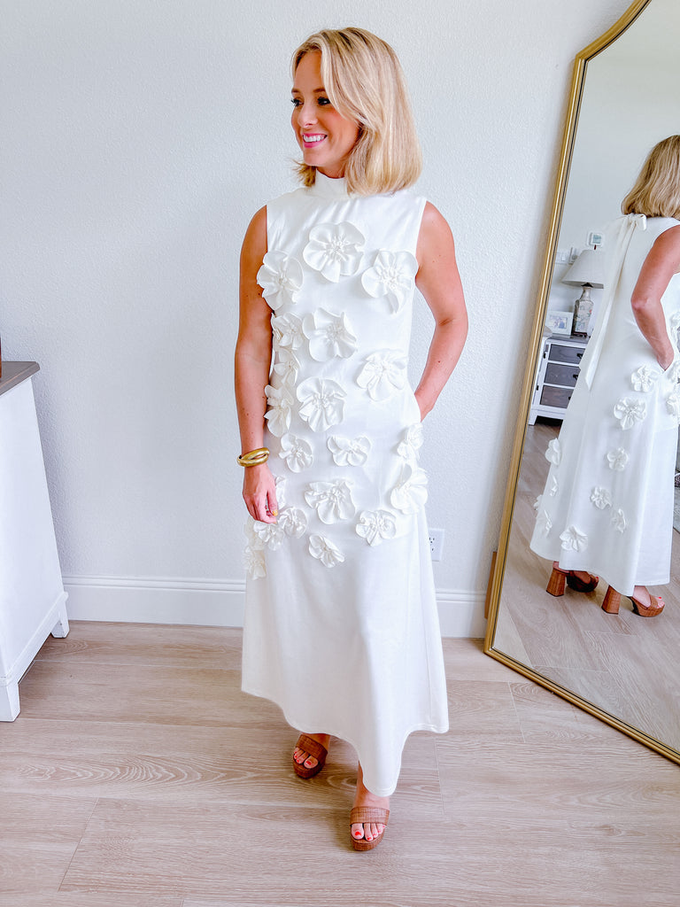This striking sleeveless dress features a high neckline, giving it an elegant and modern silhouette. It is adorned with large, three-dimensional floral appliqués that cascade down the front and the bottom of the back, adding a textured and artistic element to its design. There is also a big bow in the back at the top! The dress is form-fitting, highlighting the wearer's figure while maintaining a sophisticated and stylish appearance. This dress exudes a sense of bold femininity and is perfect for making a statement at various events. Available in Pink, White, Purple, and Baby Blue!