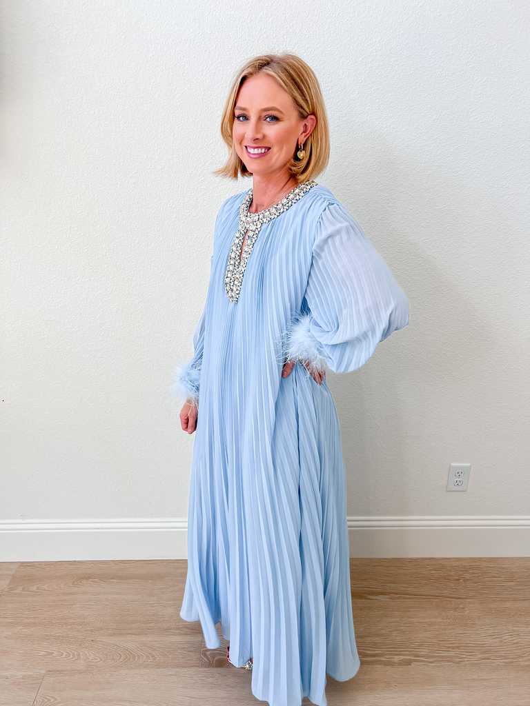 Pleated Maxi Dress with Feather Cuffs