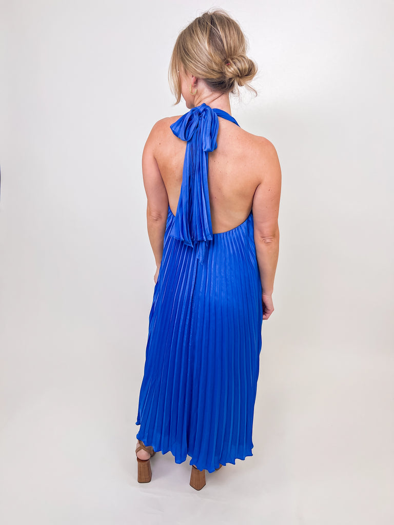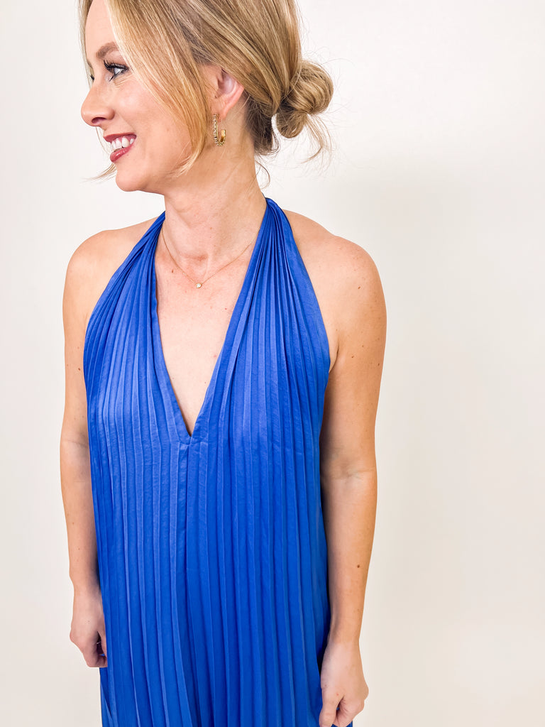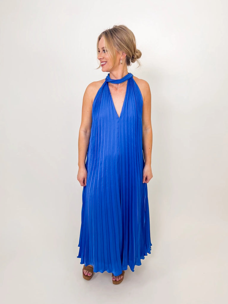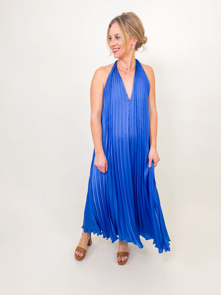 Royal Blue Pleated Halter Maxi Dress